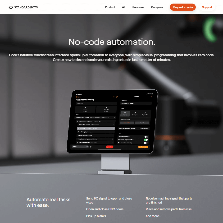 Standard Bots Core uses machine learning to identify parts and work areas with ML-driven perception and adjust motion in real time for safer, faster cycles. The built-in vision and sensors allow it to adjust in real time, whether it is tending CNC machines, handling delicate components, or working alongside people.