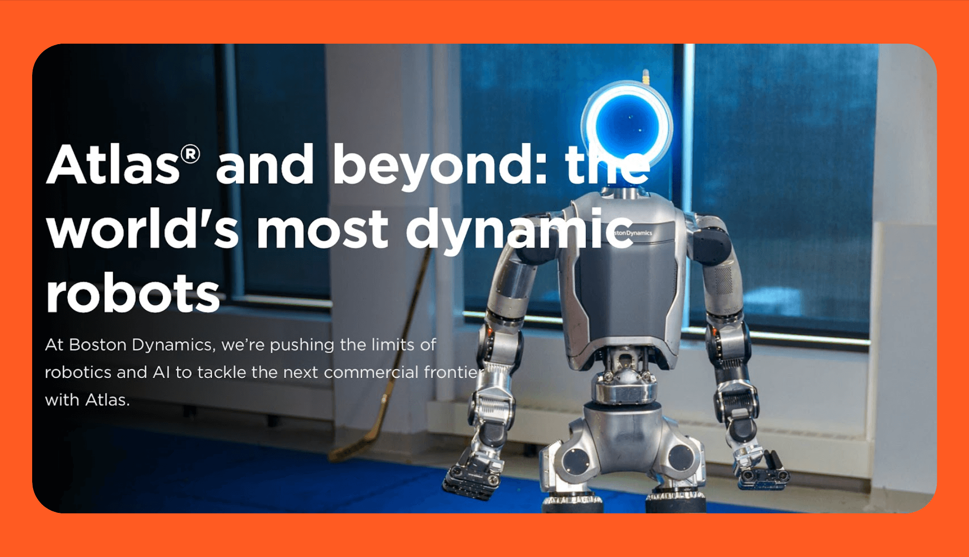 Atlas is a humanoid robot designed for research in mobility and dynamic control. It can walk, run, jump, and navigate obstacles using hydraulic actuators and advanced motion planning.