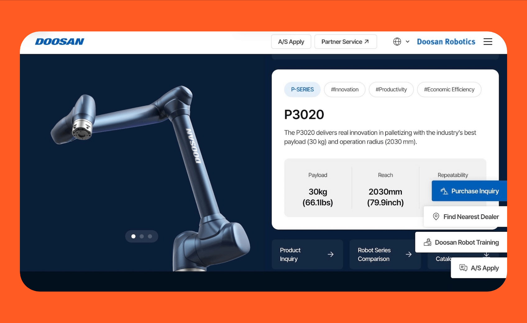 Beyond accuracy, the P Series delivers strong performance for its size, supporting payloads up to 30kg with 2.03m reach. Its advanced safety systems meet global collaborative standards, allowing it to work side by side with people safely.