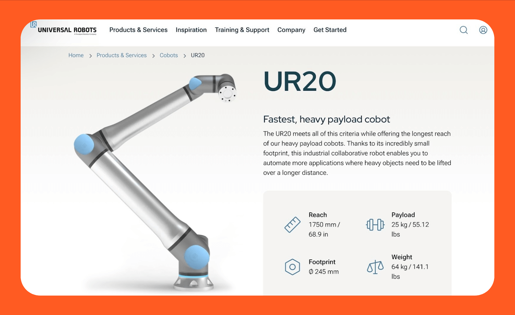 UR20 is slim enough to squeeze into tight spaces and smart enough to slow or stop if someone steps near. It can handle boxes of different sizes and materials without constant reprogramming, keeping production moving with fewer interruptions.