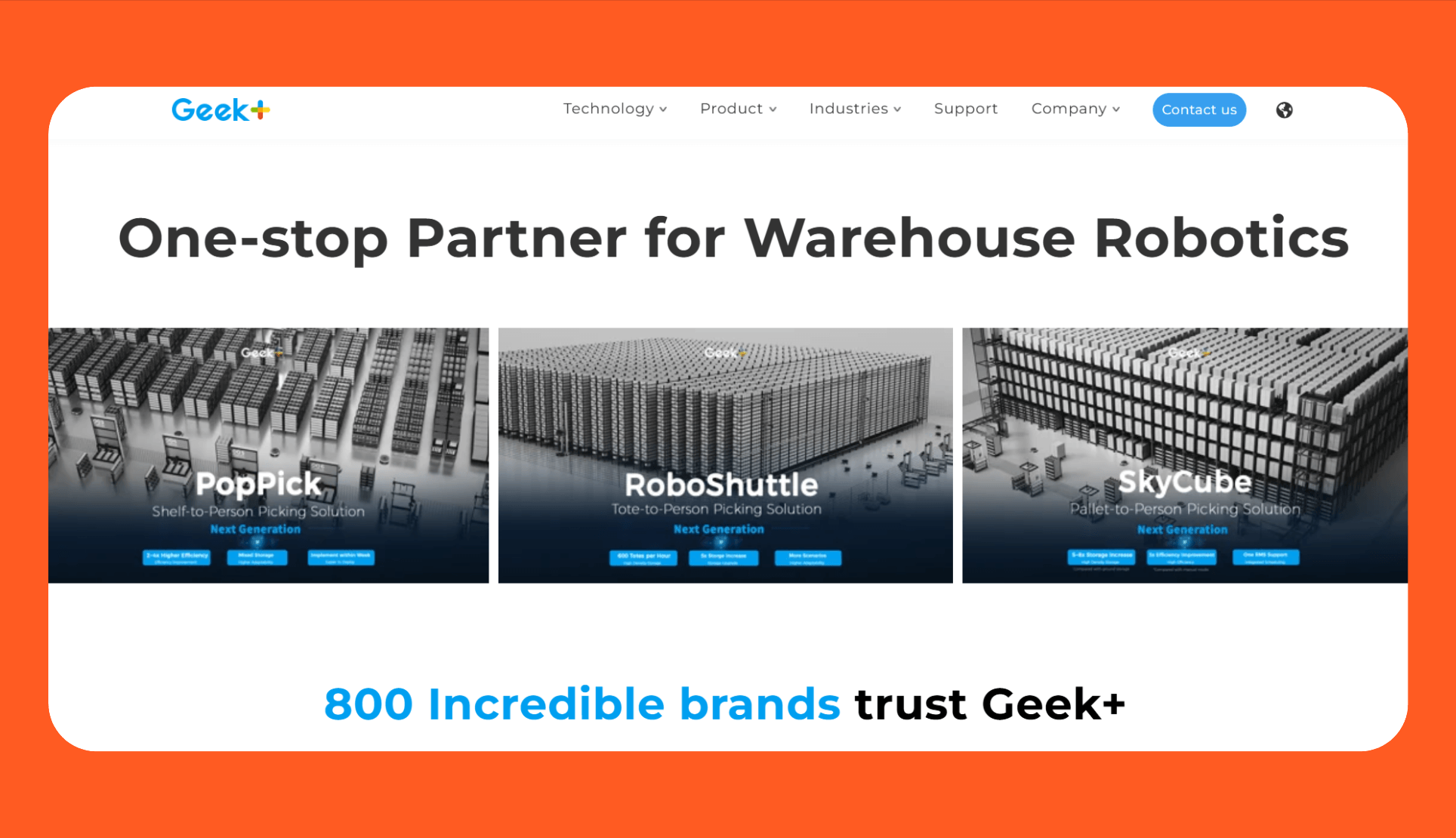 Geek+ is one of the top warehouse robotics companies based in China, with operations in over 30 countries. It builds a wide range of autonomous mobile robots (AMRs) that help with picking, sorting, moving, and storing goods in warehouses.